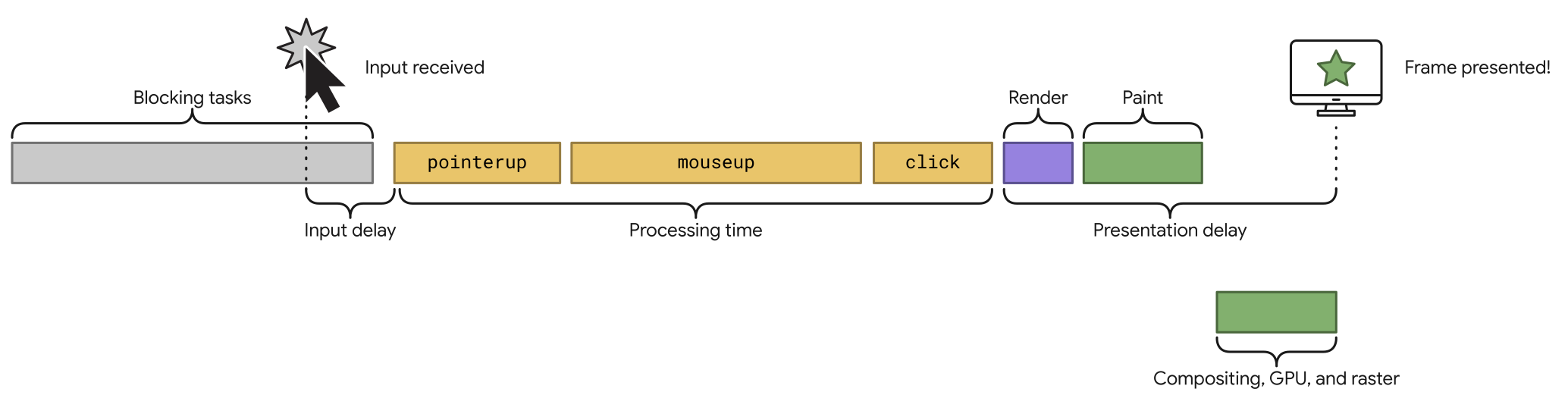 1. Input Delay: comienza cuando el usuario inicia una interacción y termina cuando el evento callback de la interacción empieza a ejecutarse.