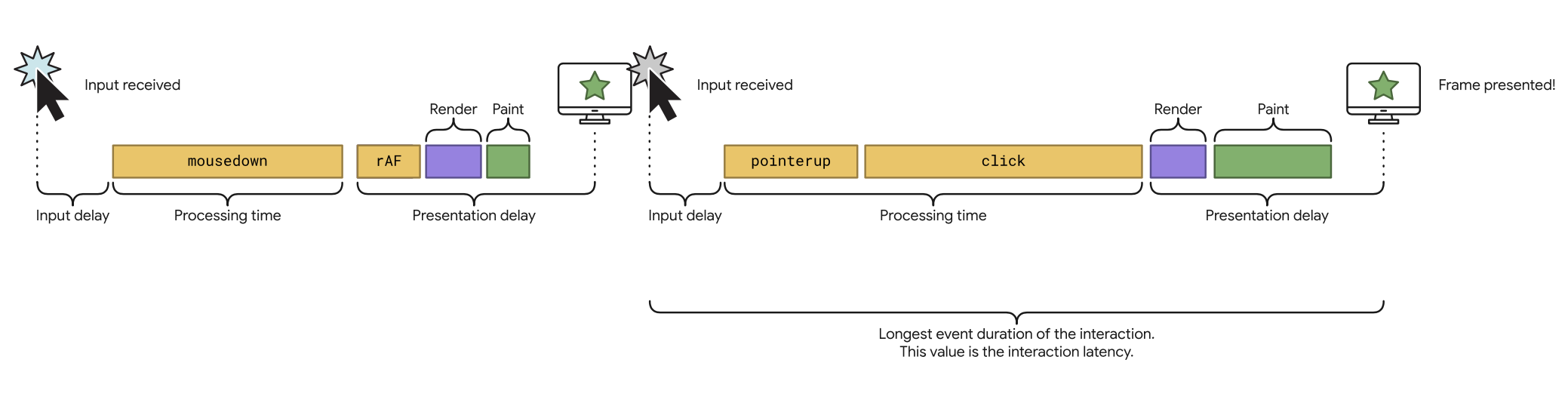 Nota: Se considera como interacción al conjunto de event handlers que se ejecutan durante el mismo gesto lógico del usuario. La latencia de una interacción es la duración más larga de un grupo de event handlers que desencadenan la interacción, desde el momento en que el usuario comienza hasta el momento en que se presenta el próximo fotograma con alguna información visual.